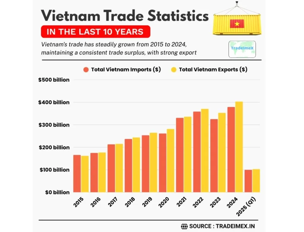Momentum carried into early 2025. In the first quarter alone, trade turnover grew 13.7% year-on-year to USD 202.52 billion, supported by exports worth USD 102.84 billion and a trade surplus of USD 3.16 billion.
